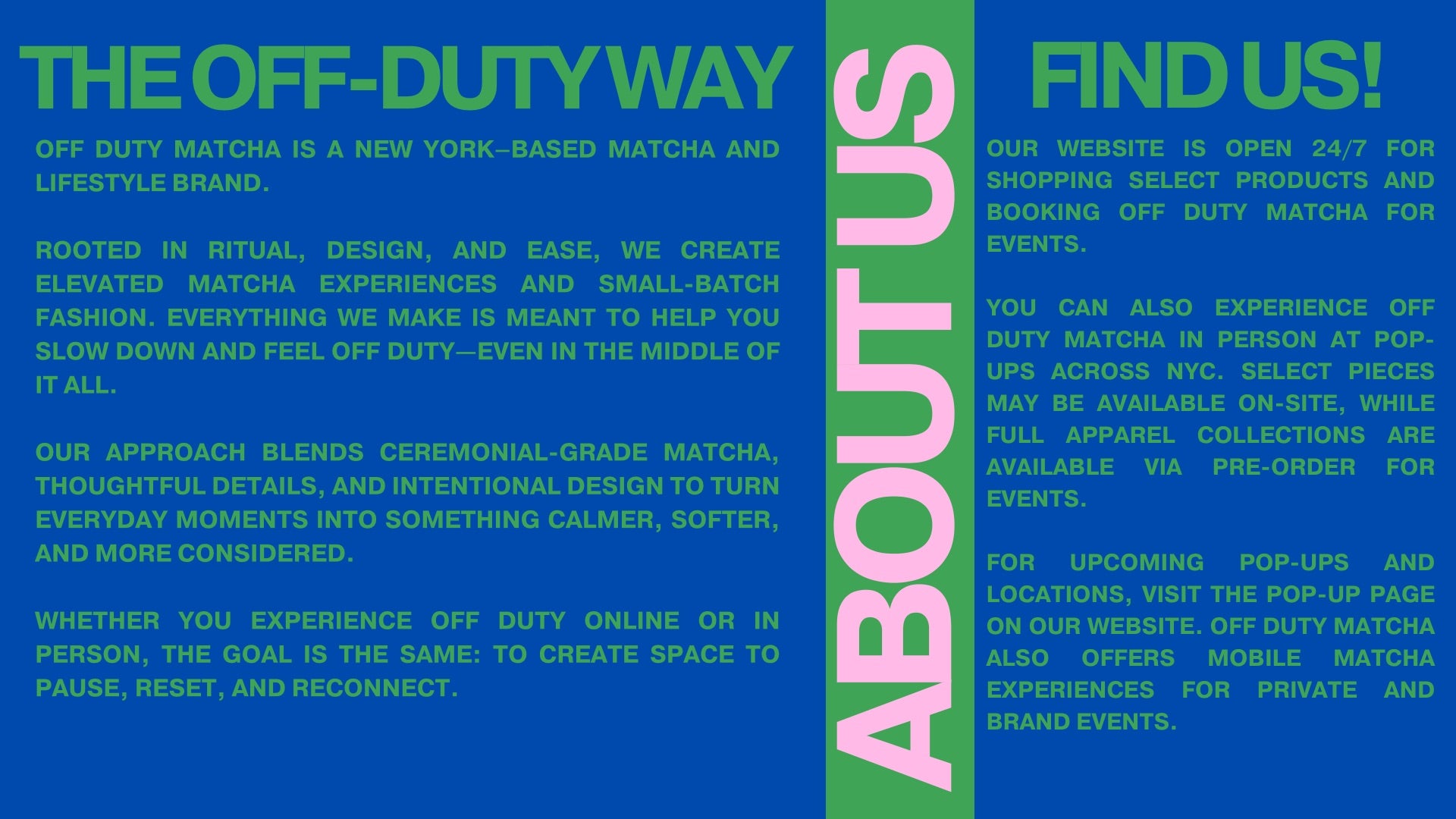 Off Duty Matcha is a New York–born fashion and wellness brand redefining what it means to slow down. We blend premium Japanese matcha with intentional, small-batch fashion to create a lifestyle that feels calm, collected, and effortlessly cool — the off-duty version of you. Fashion from New York & Matcha from Japan.