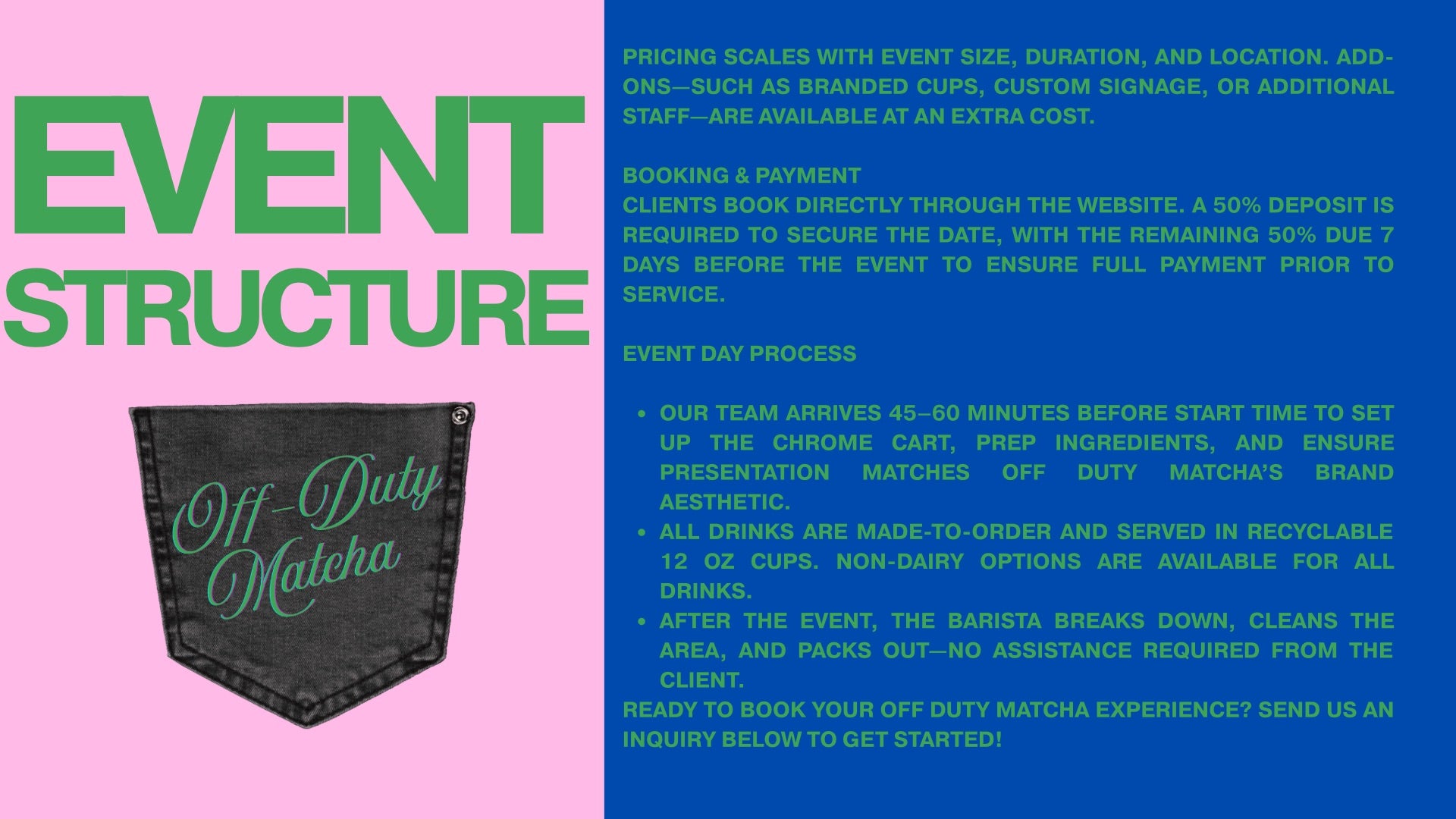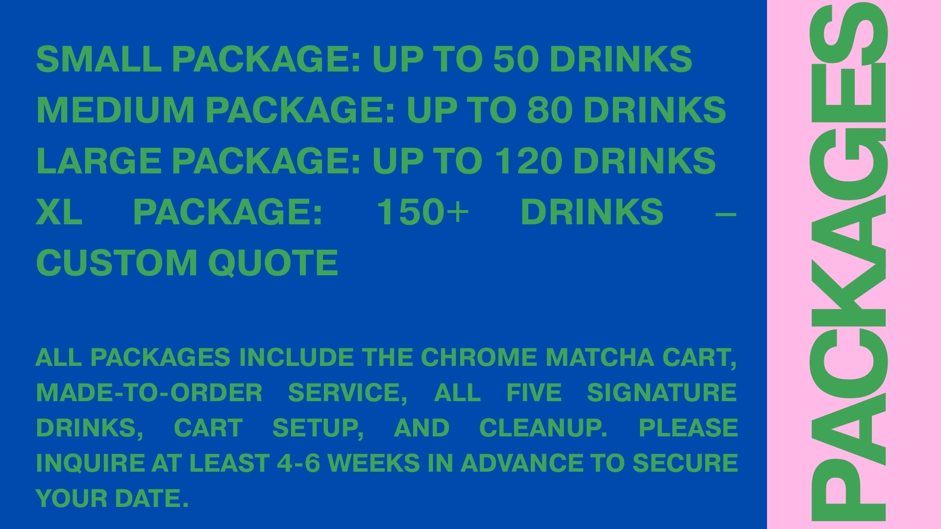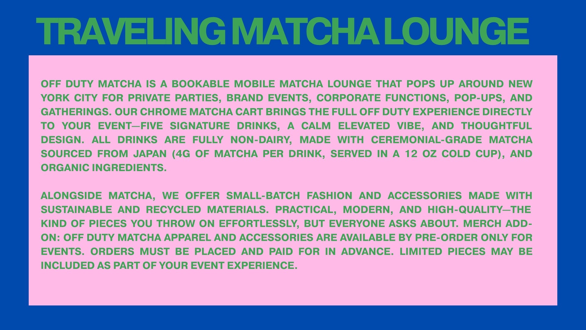 A chrome matcha cart, handcrafted drinks - A matcha fashion lounge, the ultimate Off-Duty experience. All drinks are iced, non-dairy, organic, and made with 4 grams of matcha. Served in a 12 ounce cold cup.